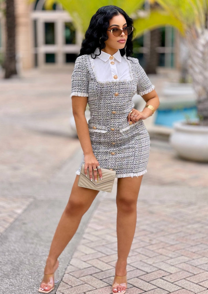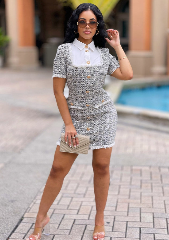 Classic, preppy and sexy, this black and white tweed mini dress features a scoop neck with an attached white high-collar shirt. Faux pockets, gold tone buttons and fringe trim keep the dress unique.